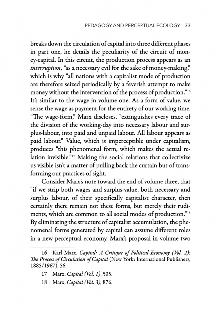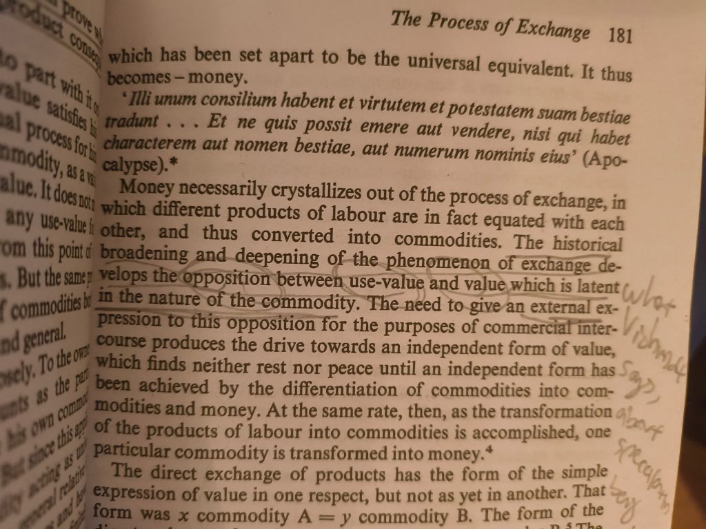 1. “Money necessarily crystallises out of the process of exchange”. This is because, as Marx has earlier analysed in the first chapter of Capital, and Alfred Sohn-Rethel beautifully elaborated in his work Manual and Intellectual Labour, commodity exchange is first a praxis, that then becomes thought. This goes back to Marx’s materialist understanding of the movement of things, in which commodities actually move and change hands, training and inhabiting our muscles and senses in specific ways. This process is then echoed and justified in the mind retroactively — not least because we depend on it for our survival, and its justification in capitalism means the justification of our existence.
